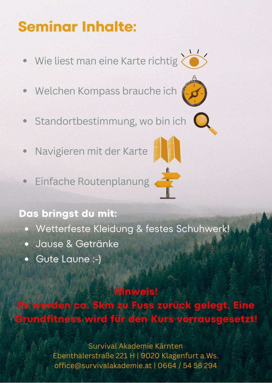 Navigieren mit Karte und Kompass € 110,- je Teilnehmer Verbindliche Anmeldung bis 07.05.2026 unter: info@survivalakademie.at oder +43 664 5458294 + Add to Google Calendar + iCal / Outlook export Date 09.05.2026 Time 10:00 - 17:00 Kosten € 110.00 Ort Sillehof Sillebrücke 1, 9064 Magdalensberg Kategorien Tagesseminar Veranstalter Lukas Brachmaier Phone +43 664 5458294 Email info@survivalakademie.at Share this event